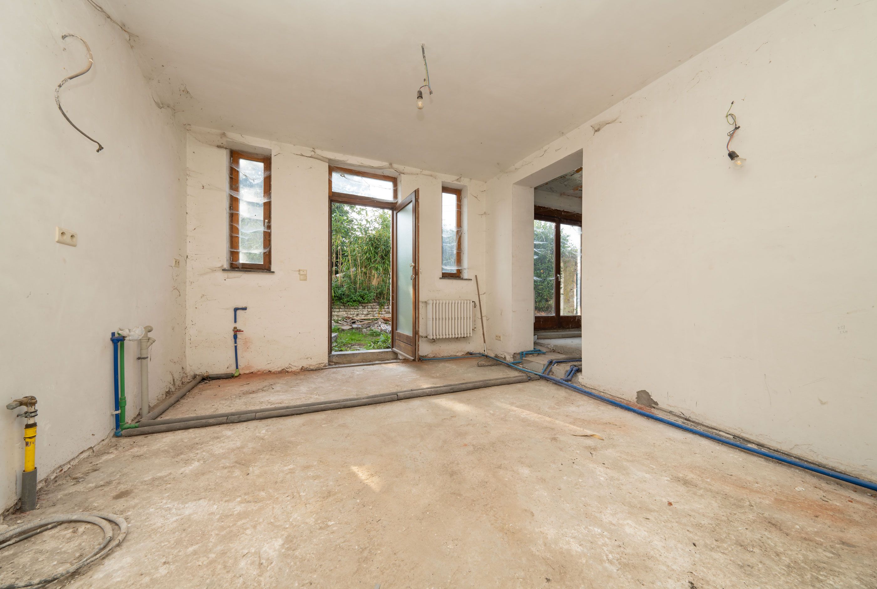 grand living (44m²) en L, cuisine (2m35x3m40), cage d'escalier (3m50x3m70), deuxième grand salon (45m²), espace attenant (3m85x4m20) pouvant accueillir une seconde cuisine, buanderie/débarras (2m85x2m75) avec l'escalier vers le sous-sol, espace ouvert à aménager (4m90x11m00) à l’extrême gauche du rez-de-chaussée, jardin avec portail d’accès situé du côté droit de la parcelle (rue Kruiskensheide)