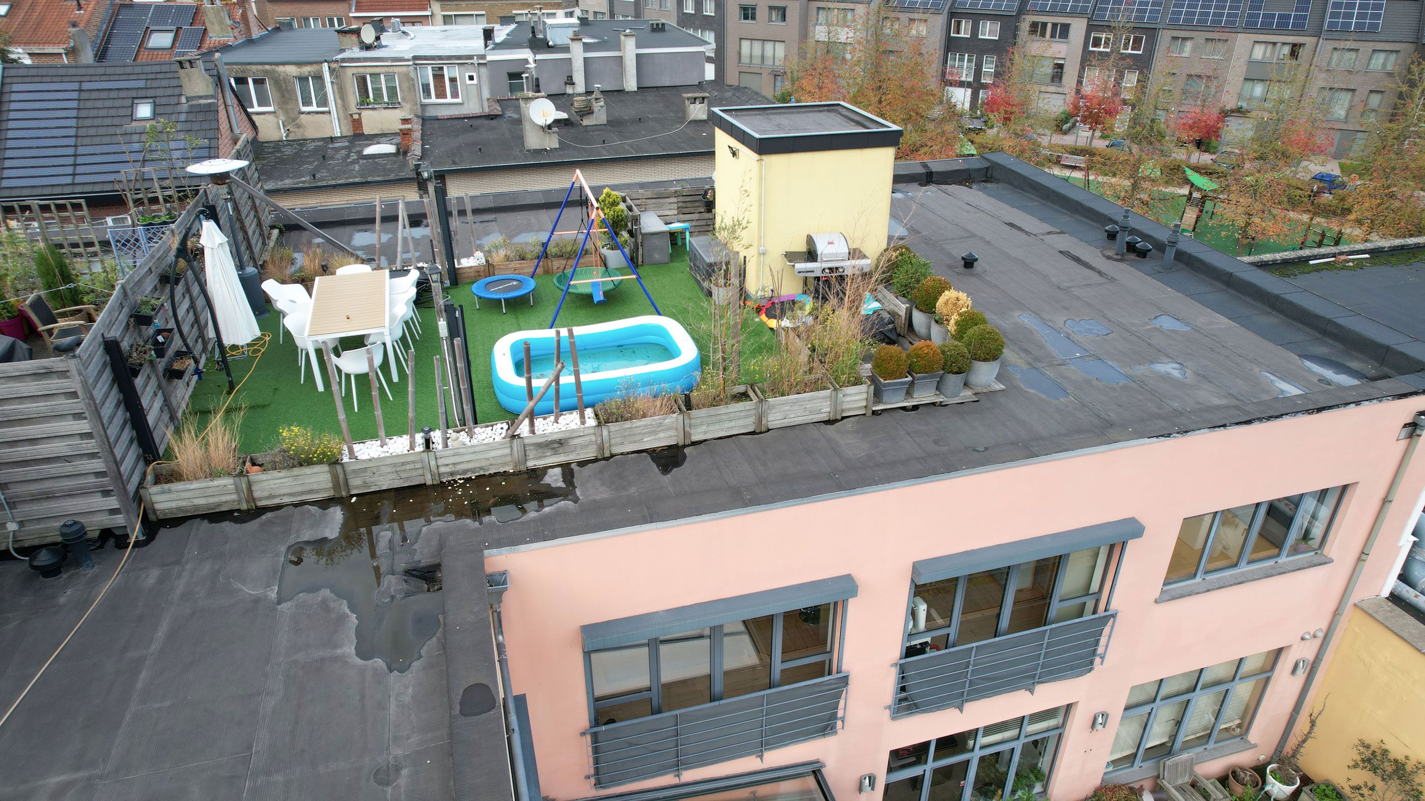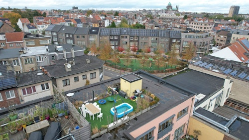 ruime inkomhall (3m45x4m30), hang-WC en wastafeltje, wasplaats (1m20x0m90), prachtige leefruimte met open keuken (samen 100m²), nachthall, tweede WC, bureelhoek (1m20x2m75), slaapkamer 1 (3m85x3m10) met aanpalende dressing (1m00x3m90), slaapkamer 2 (12m²), slaapkamer 3 (12m²), badkamer (2m60x2m60), stookruimte (1m15x1m30), trap naar het schitterend dakterras (40m²) met een prachtig uitzicht over Brussel.