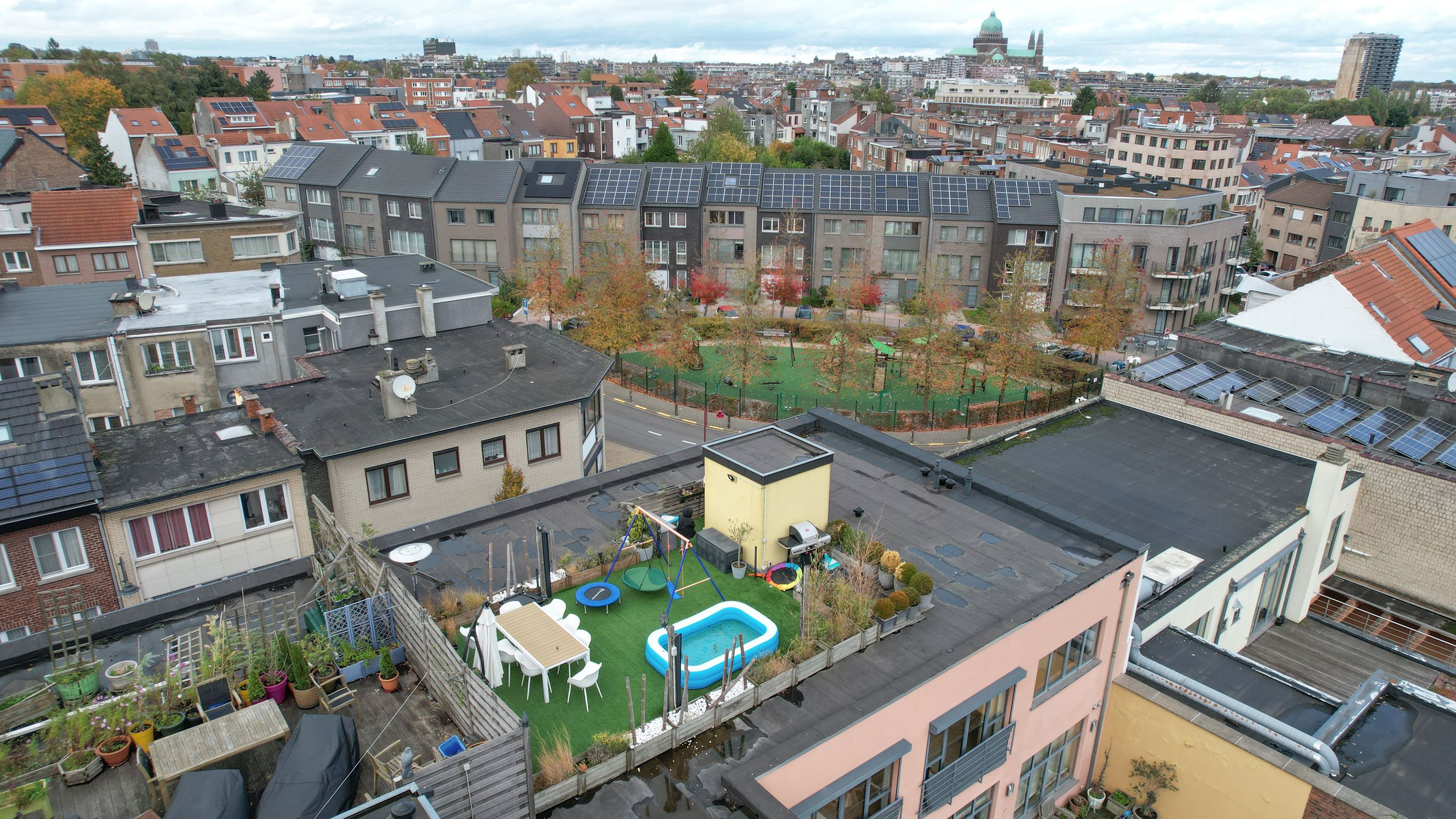 ruime inkomhall (3m45x4m30), hang-WC en wastafeltje, wasplaats (1m20x0m90), prachtige leefruimte met open keuken (samen 100m²), nachthall, tweede WC, bureelhoek (1m20x2m75), slaapkamer 1 (3m85x3m10) met aanpalende dressing (1m00x3m90), slaapkamer 2 (12m²), slaapkamer 3 (12m²), badkamer (2m60x2m60), stookruimte (1m15x1m30), trap naar het schitterend dakterras (40m²) met een prachtig uitzicht over Brussel.