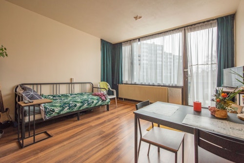 Studio op het gelijkvloers, bestaande uit: inkomhall (4,5m²), living met open keuken (23m²), badkamer met bad, wastafel en aansluiting voor wasmachine (4m²), terras (8m²)