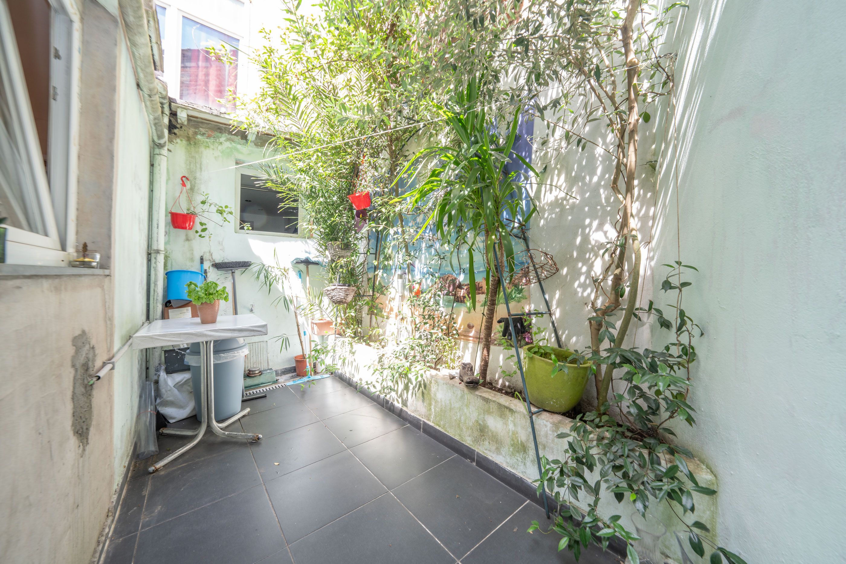 Gelijkvloers (87m²): inkomhall (1m70x5m50) met de trap naar de verdieping, salon (3m20x3m80), eetplaats (2m85x3m55), zithoek (2m15x3m55), ruime, ingerichte keuken (3m15x4m90), badkamer (1m75x3m45) met ligbad, meubel met wastafel en WC, overdekt terras (8m²), koer (8m²).