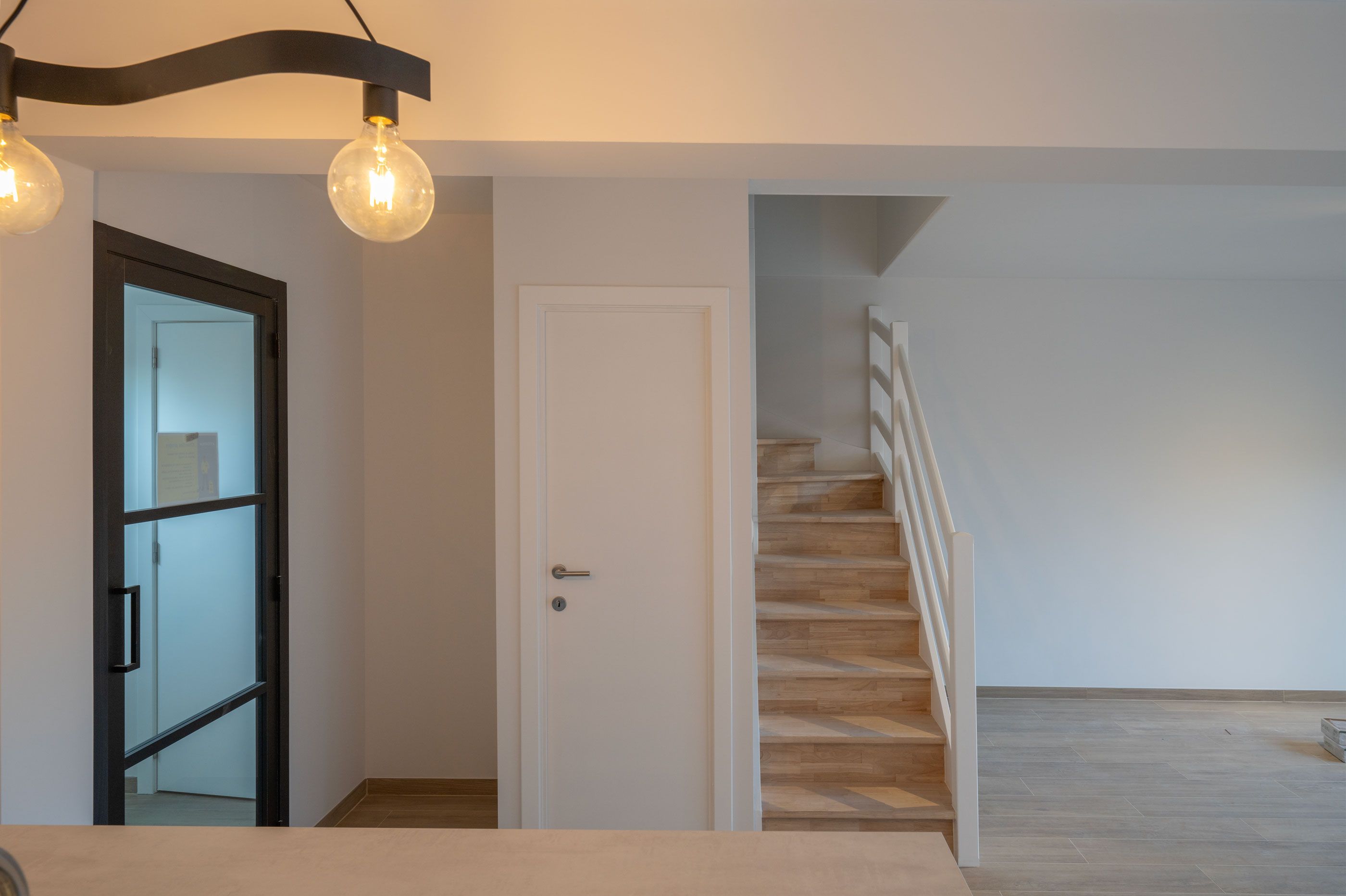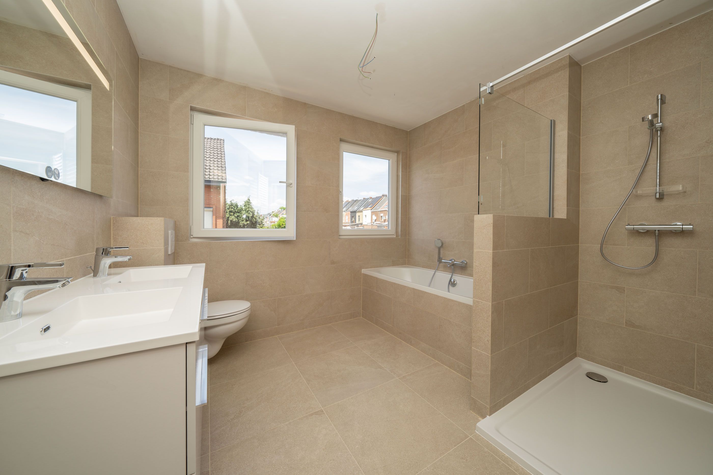 Op de eerste verdieping (63m²): nachthall met vaste trap naar de tweede verdieping, 3 slaapkamers, ruime badkamer met ligbad, aparte douche, meubel met 2 wastafels en WC.