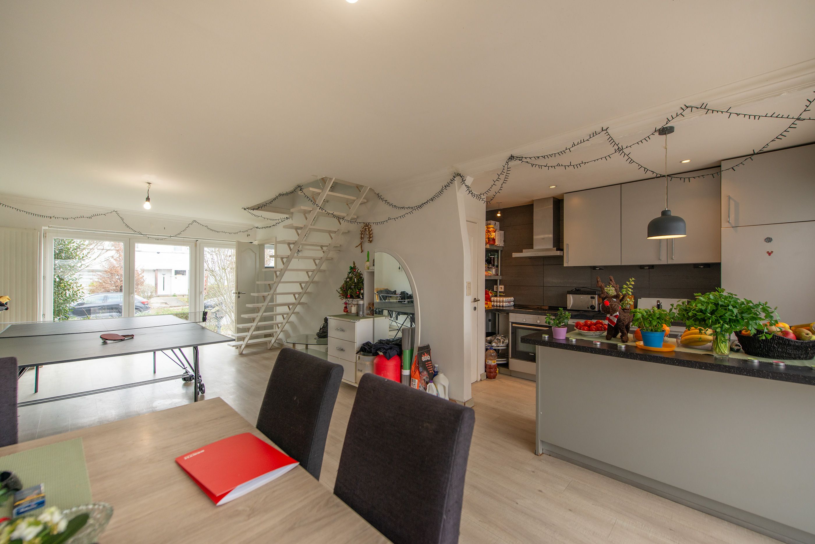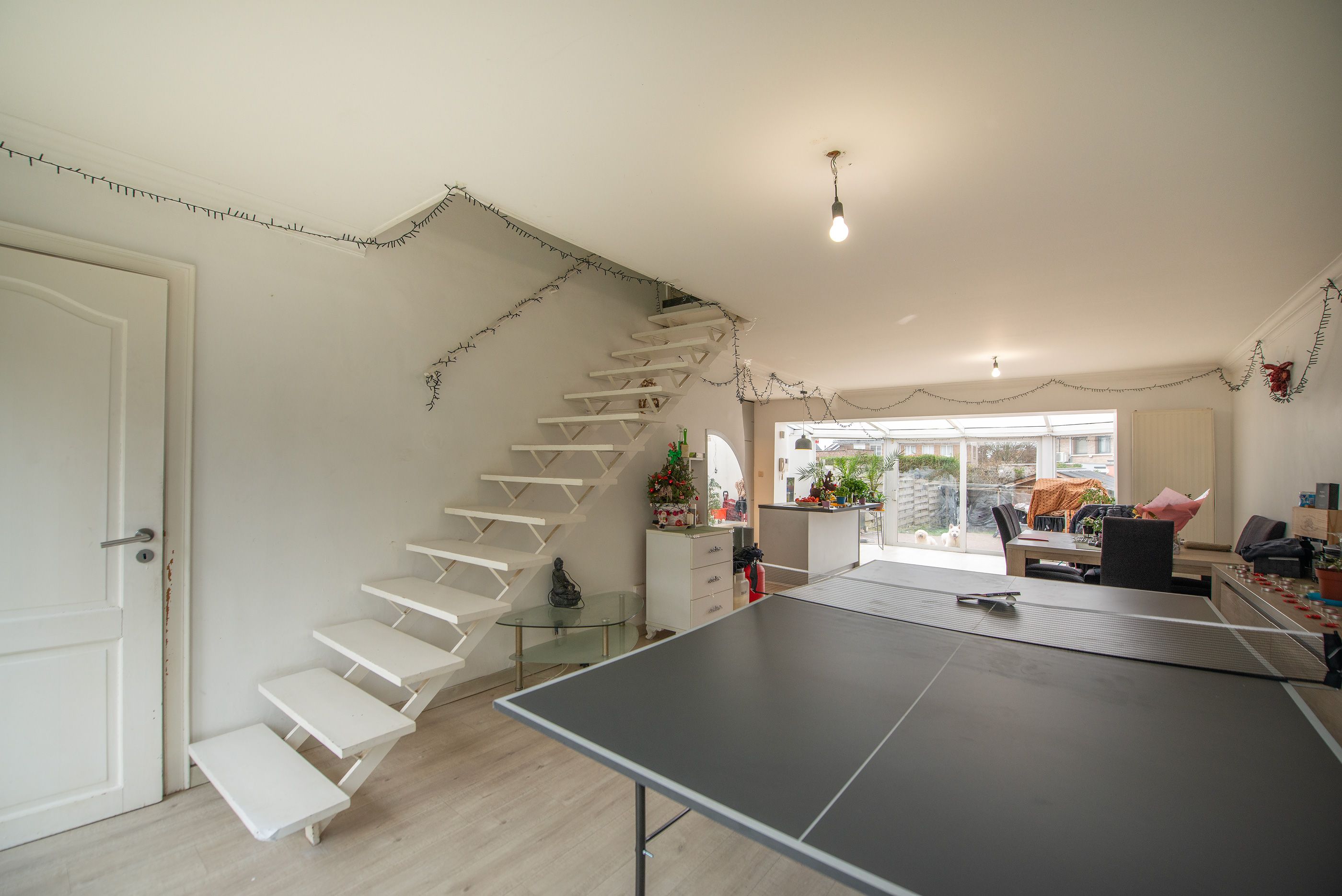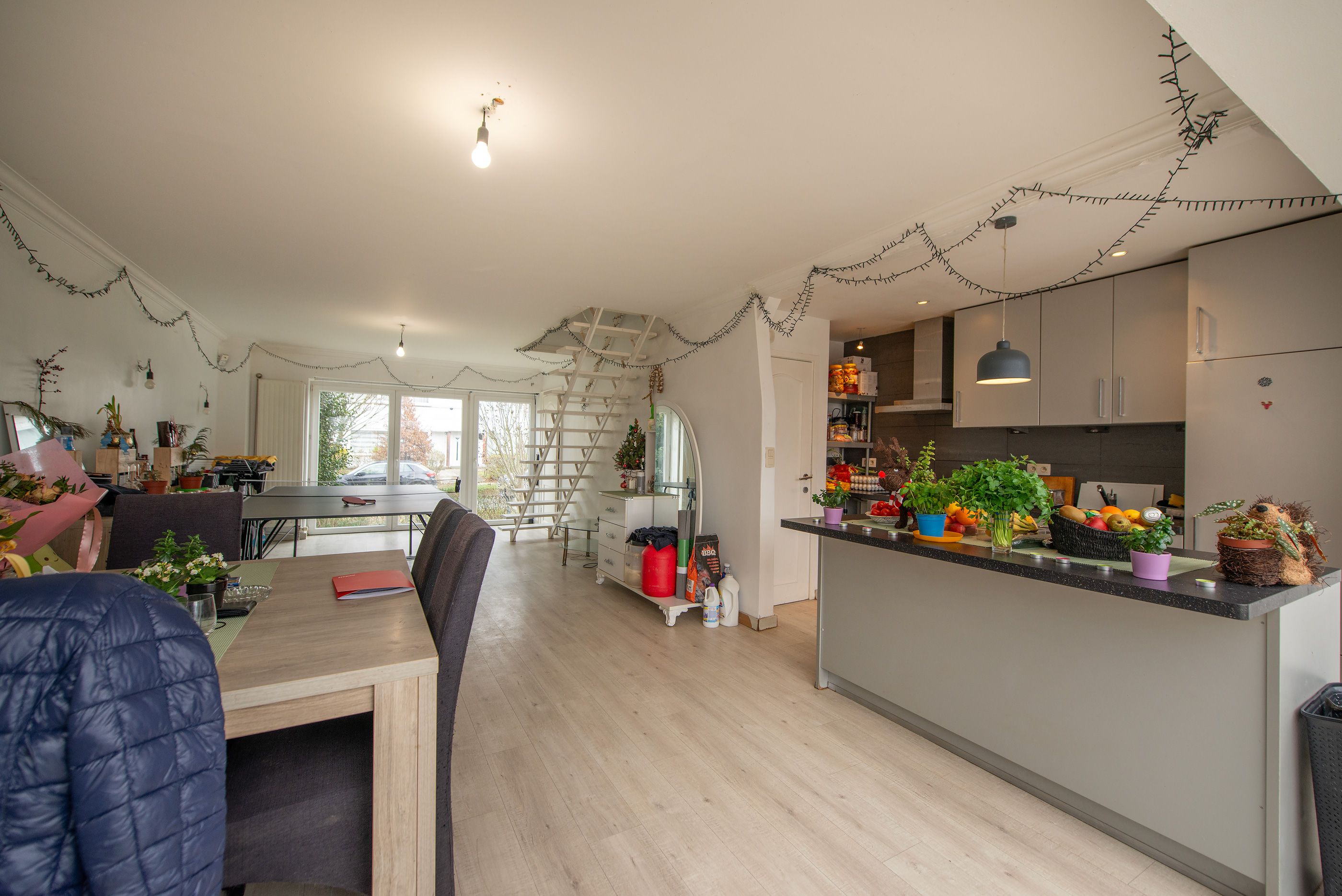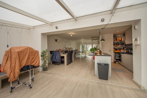Gelijkvloers: inkomhal, apart toilet, ruime woonkamer/eetkamer met open en volledig uitgeruste keuken (50 m²), aangename veranda van +-17 m² met directe toegang tot het terras en de tuin.